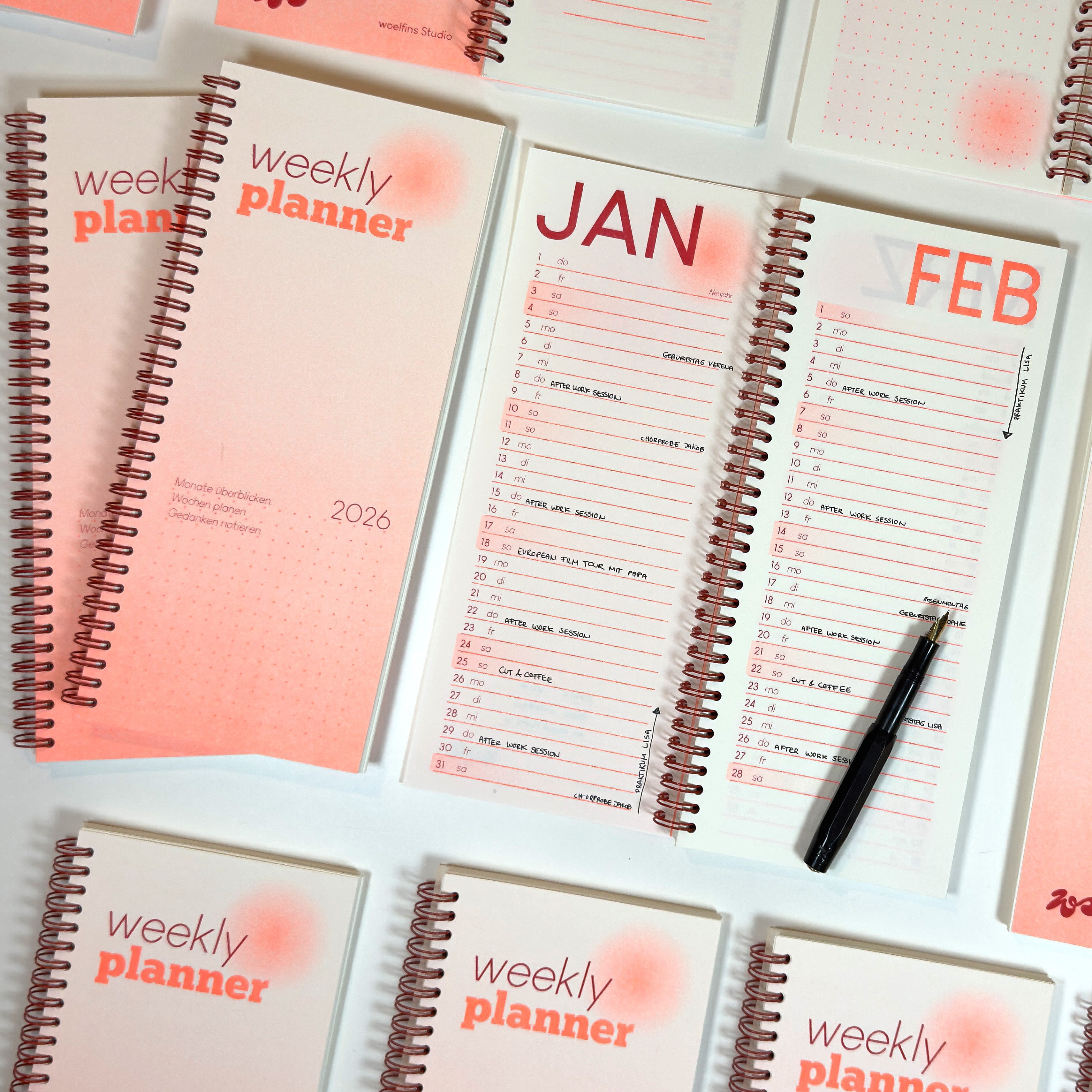 Der erste Wochenplaner, der eigens im woelfins Studio gedruckt, geschnitten, sortiert, gelocht und gebunden wird. Gestaltet nach dem Motto "so viel wie nötig, so minimalistisch wie möglich":